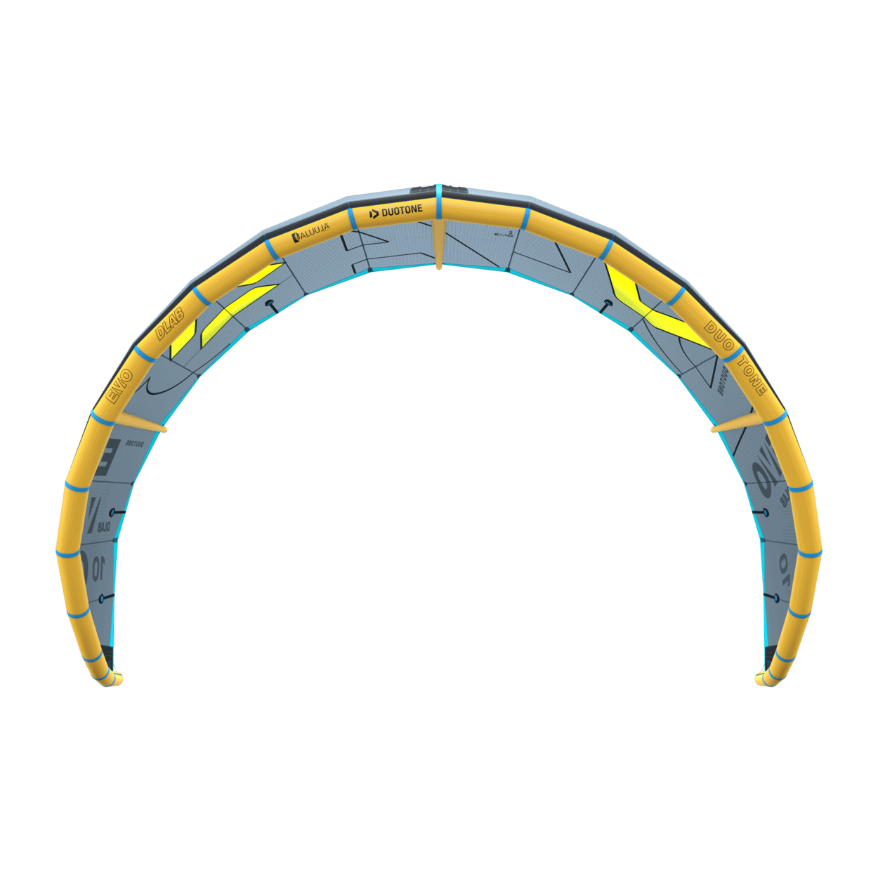 Introducing the Duotone Evo D/LAB, the ultimate high-performance allrounder kite for ambitious riders and that has proven itself as the King of the Air together with Andrea Principi and winner of numerous big air competitions. Built with Aluula Gold and Trinity TX, the Evo D/LAB delivers unrivaled low-end power, incredible top-end control, and stability, making it the kite of choice for serious riders aiming to elevate their performance. This kite is designed for those who demand the best. Experience effortless, floaty hangtime that allows you to extend your aerial maneuvers and an unmatched vertical boost that surpasses everything else in the Duotone range. The Evo D/LAB empowers you to push your limits and explore the true potential of your riding. Key to its exceptional performance is the improved upwind efficiency and depower capabilities. The narrower leading edge reduces air resistance, allowing the kite to fly further forward in the wind window, enabling better upwind performance and more effective depower. This advancement ensures that you can ride confidently in a wide range of conditions without compromising performance. For precise control and an improved riding feel, the Evo D/LAB features a new 6-point bridle system that ensures smooth and direct power transmission. The longer bridle enhances control even at full depower, expanding the kite’s wind range for even more versatility. An additional segment in the tips contributes to a more agile response and playful freeride feeling, providing faster turning capabilities and more direct steering. The lighter, more precise bar feedback enhances control and playfulness, ensuring you receive instant position feedback from the kite, which translates to reliable, smooth power delivery and intuitive handling. In strong winds, the combination of the narrower leading edge and the advanced 6-point bridle system offers increased stability and reliability, enabling you to maintain control throughout your ride. Optimized jumping and looping performance are hallmarks of the Evo D/LAB. With optimized seam construction, combined with the narrower leading edge and improved tip geometry, this kite allows for explosive jumps and precise loops, giving you the confidence to execute the most ambitious maneuvers. Experience the pinnacle of kiteboarding performance with the Duotone Evo D/LAB - the kite that sets you apart and propels you to new WOO heights. Unleash your potential and redefine your riding with the Evo D/LAB, where performance meets cutting-edge technology!